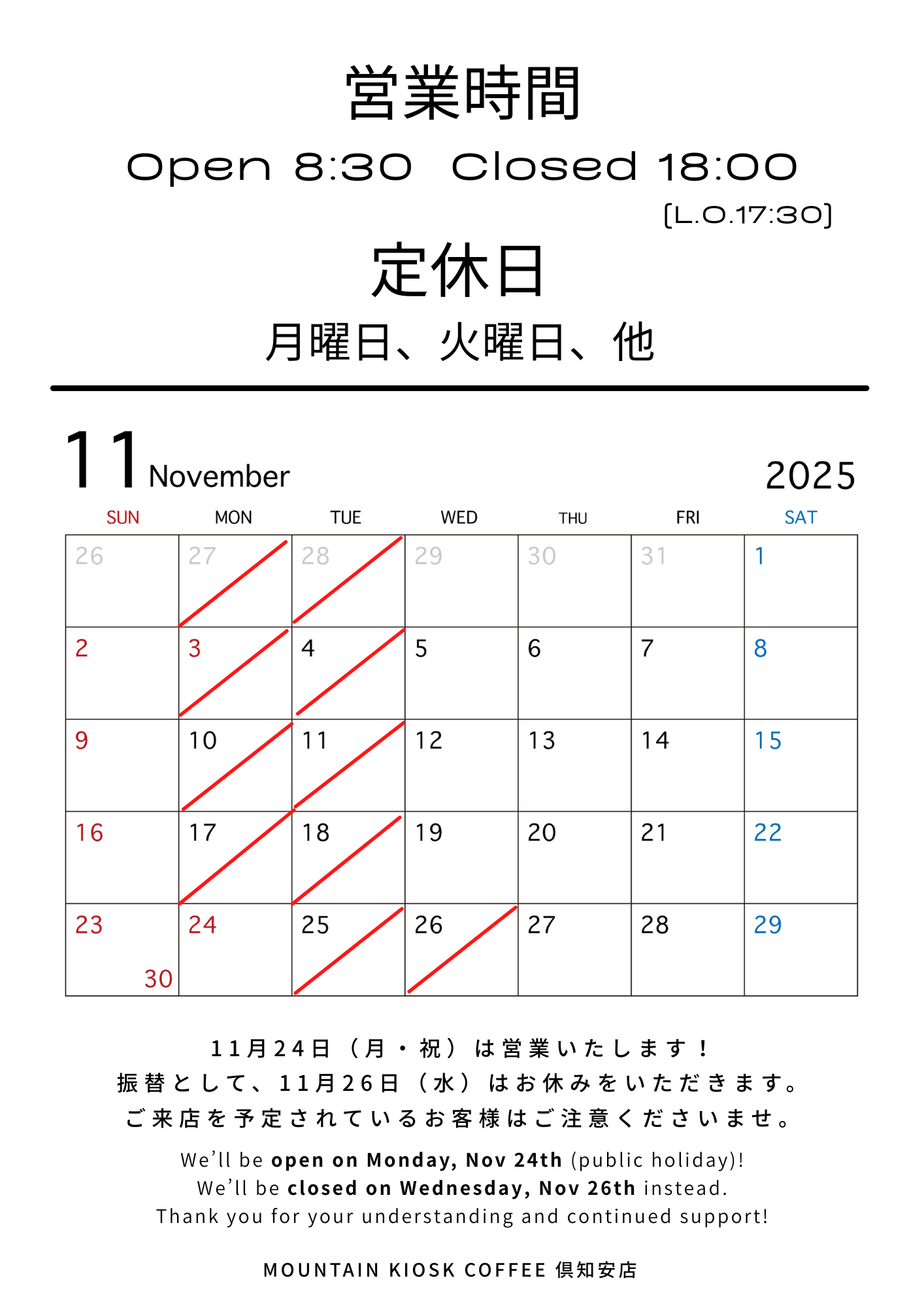 振替として、11月25日(水)はお休みをいただきます。